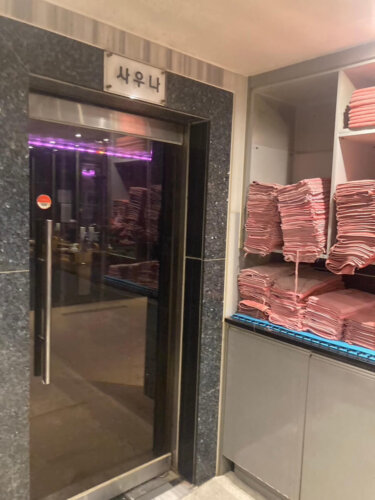 「B」のロゴがあるガラス扉を開けて入店すると、韓国按摩店とは思えないほど広くて綺麗な空間が広がっていた。通常の韓国按摩店の受付は狭い場合が多い。ここ最近行った韓国按摩の中では一番キレイで広かった。