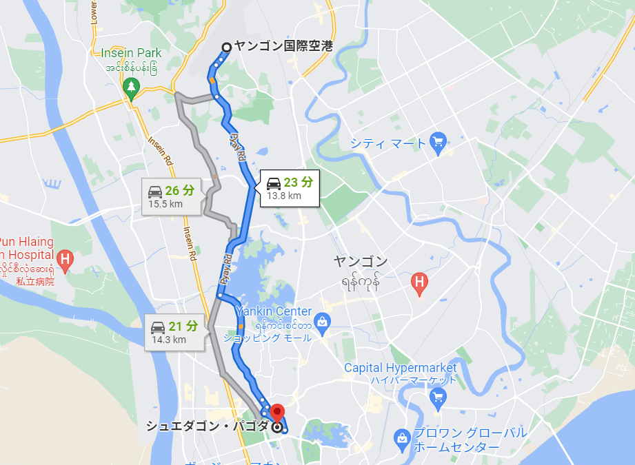 「ヤンゴン」の中心地は「ヤンゴン国際空港」から車で約25分の場所にある。地下鉄や電車は整備されていないため、使える交通手段はバスかタクシーだ。
