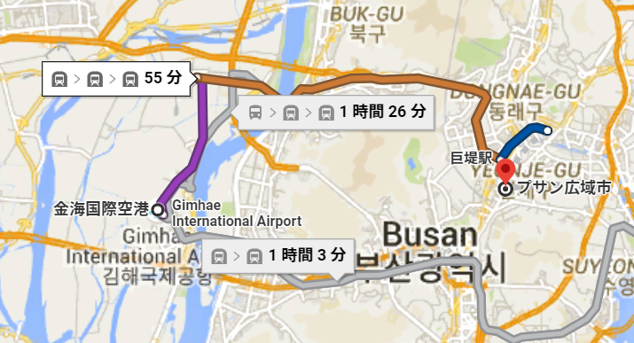 釜山へは「金海(キメ)国際空港」から電車で1時間ほど。日本からの直行便は「成田空港」や「関西国際空港」を含む6つの空港から出ているため、アクセスもしやすいゾ。